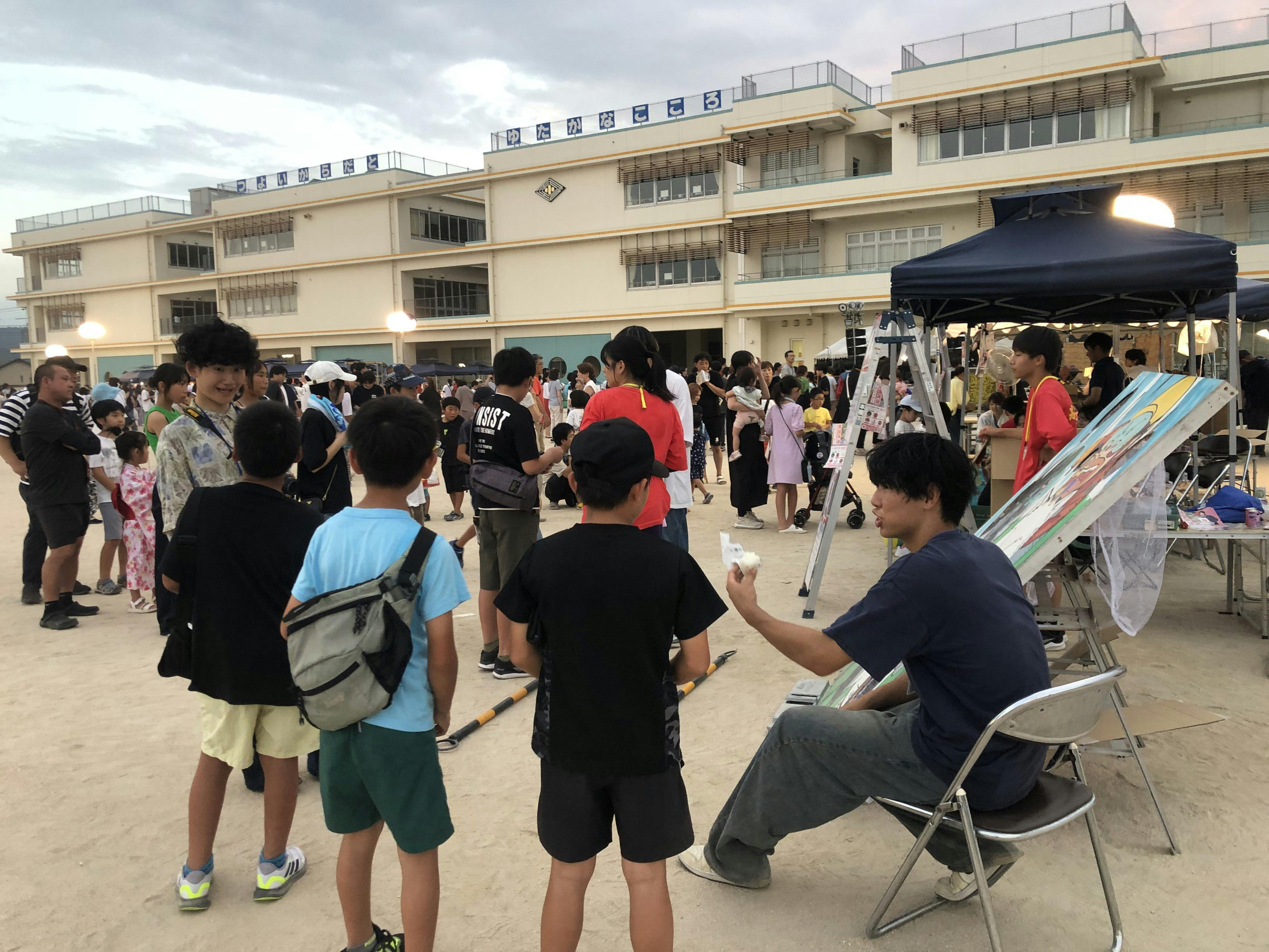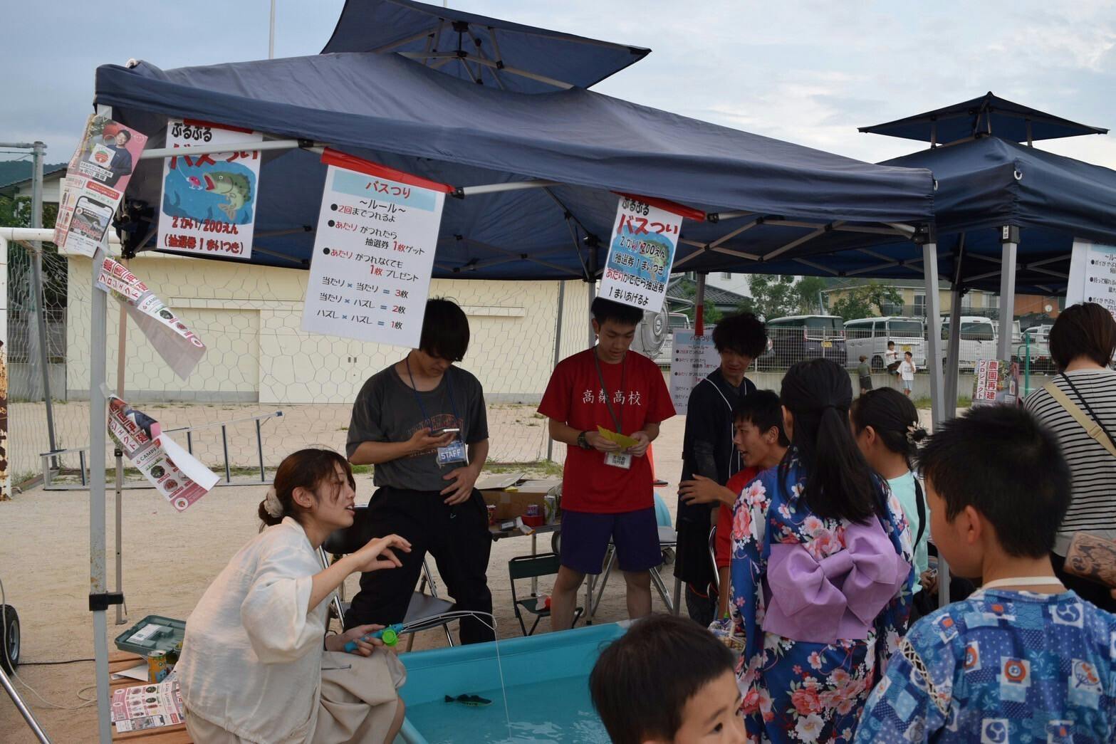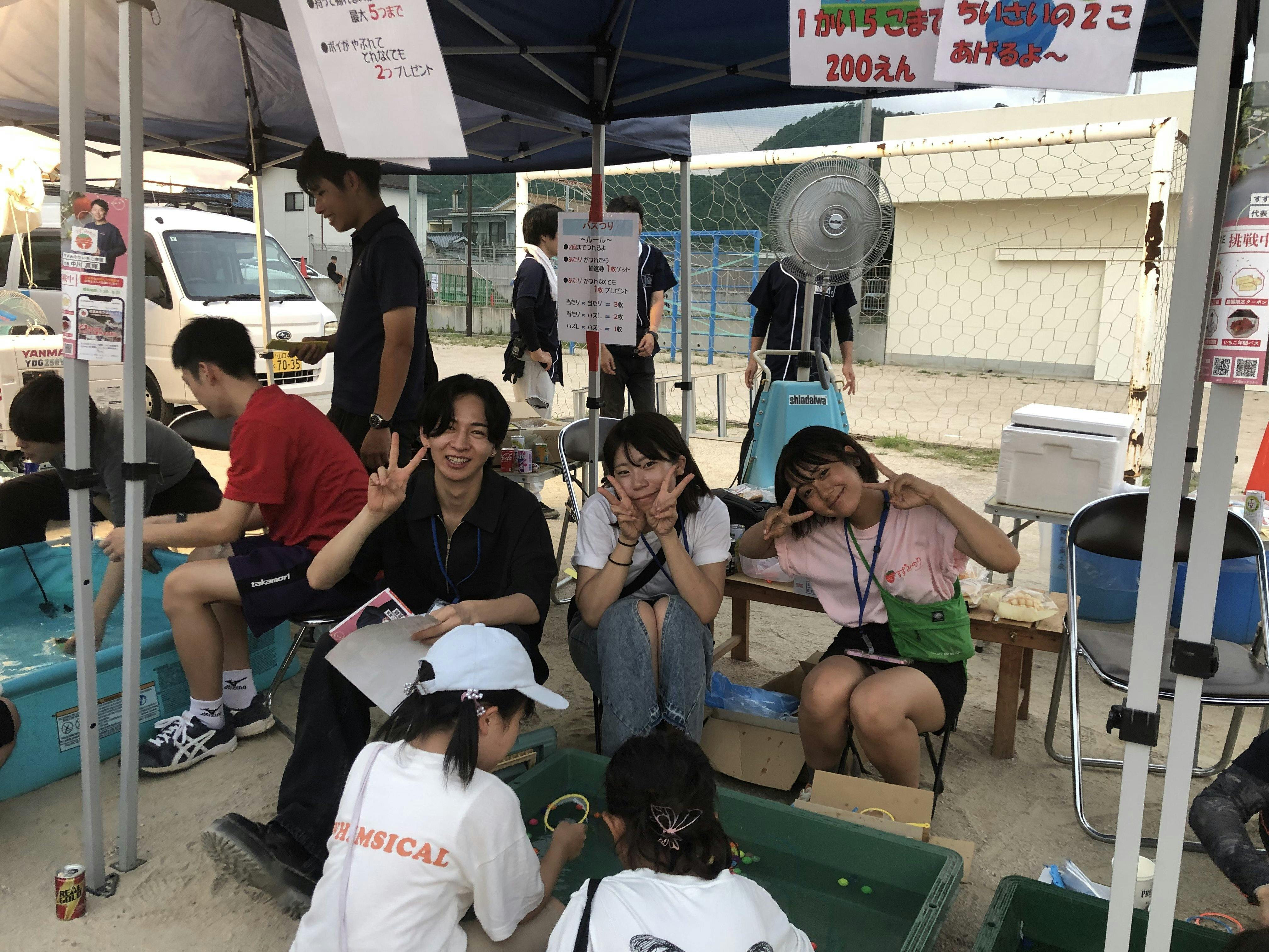 玖珂夏祭りは市内外から多くのキッズが集まる祭りで、当初ポテトや唐揚げ、かき氷のみの出店で行う予定だったのですが、大学生のインターンシップ期間と重なるということで急遽さかな釣り、スーパーボールすくい、まとあての出店を追加!!