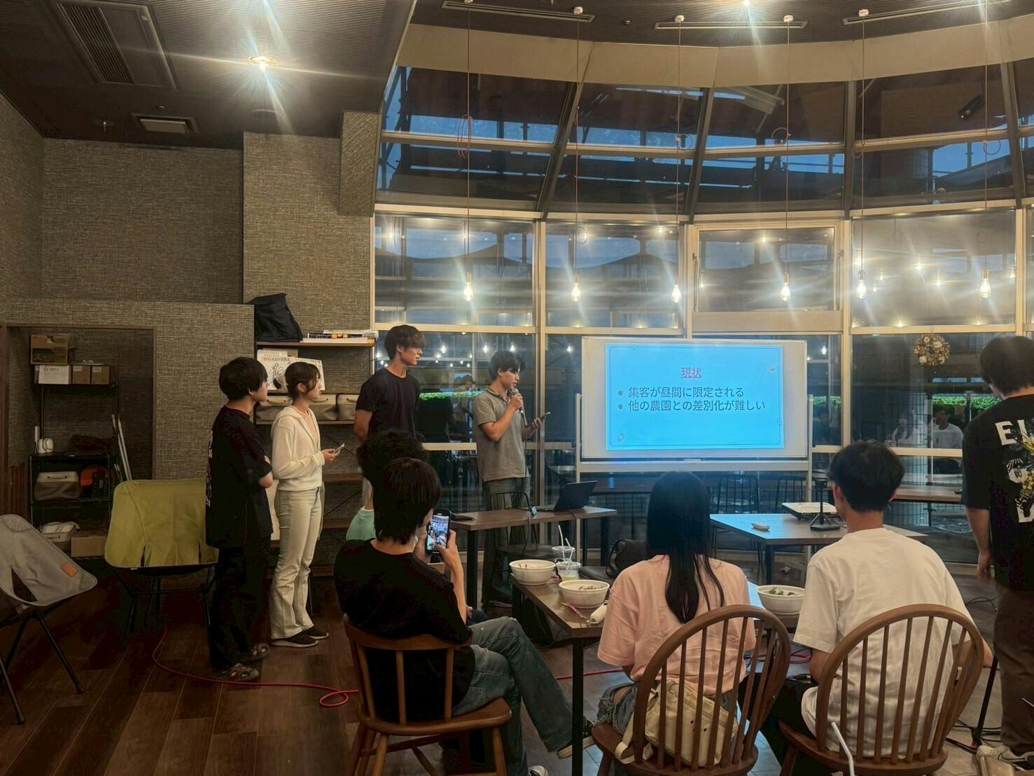 みんなで夜ご飯を食べながら1週間、山口で感じた感覚、実体験を頼りにすずみのりいちご農園のいちごの価値を最大化させるをテーマにビジネスピッチ大会を行いました。スズランドには記念ピッチ登壇者として 〈株式会社デナリファーム〉 代表平岡誠様をお招きし新規就農6年目のいちご農家のリアルを語っていただきました(^▽^)